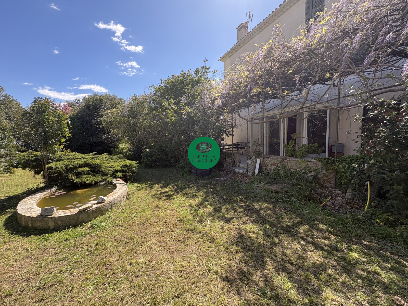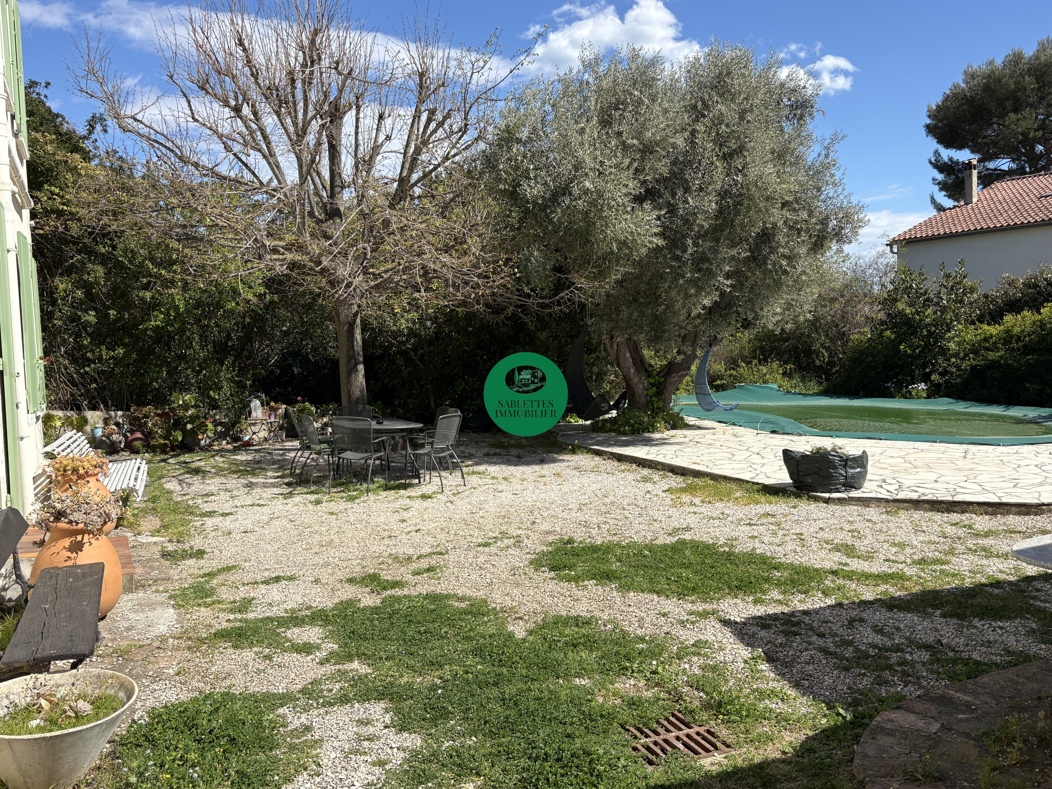 Le terrain arboré est un véritable écrin provençal : olivier centenaire, palmiers, bassin ornemental en pierre… Et en son cœur, une belle piscine entourée d'un dallage en pierre naturelle en partie ombragée — l'espace idéal pour profiter des longues journées ensoleillées, que ce soit pour un usage personnel ou pour enchanter des hôtes.