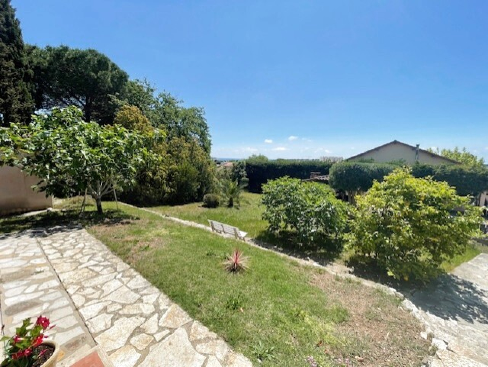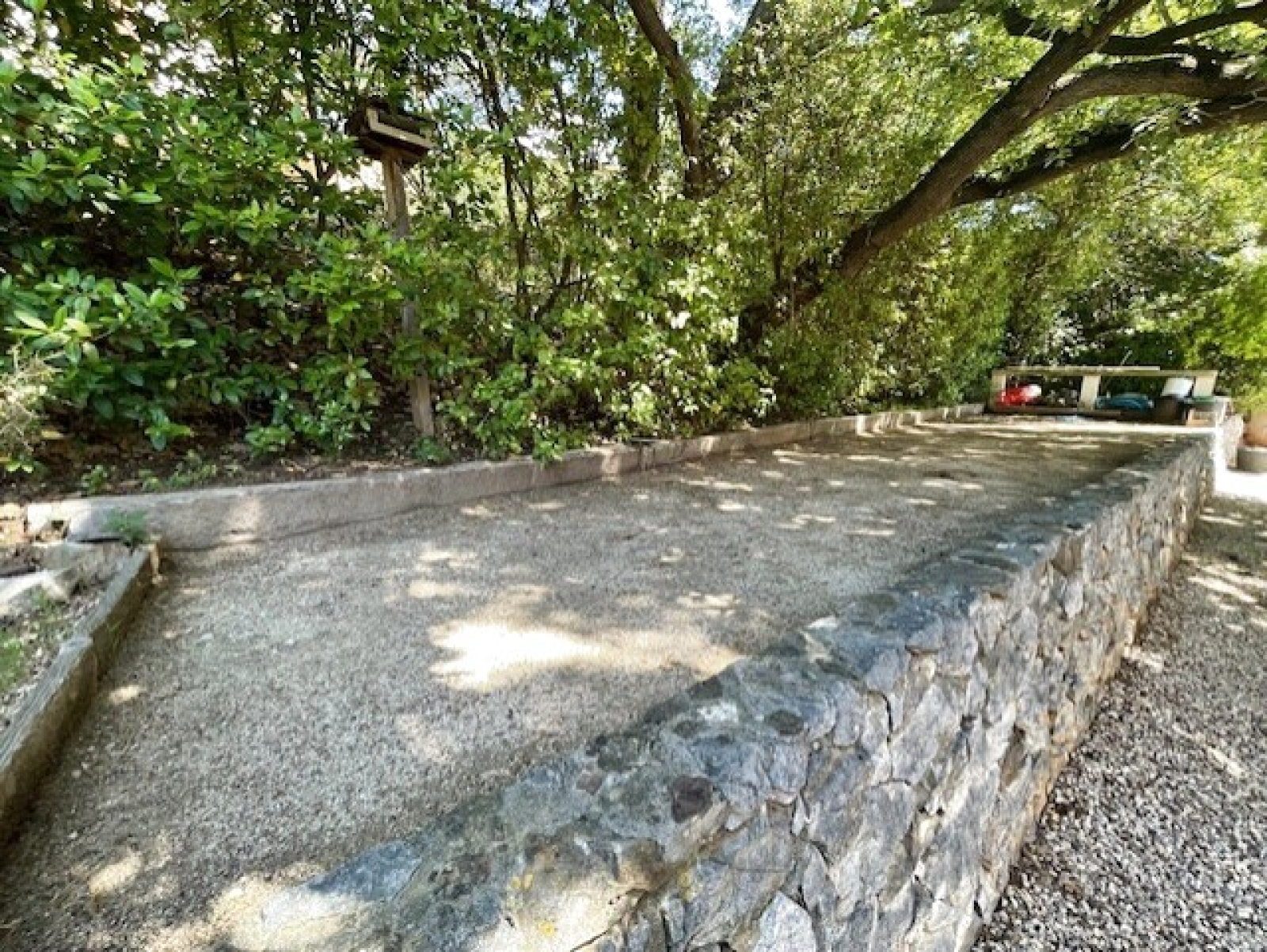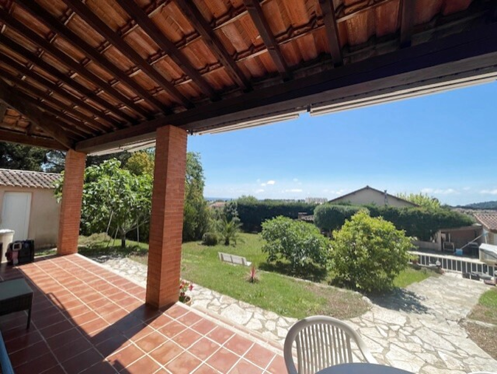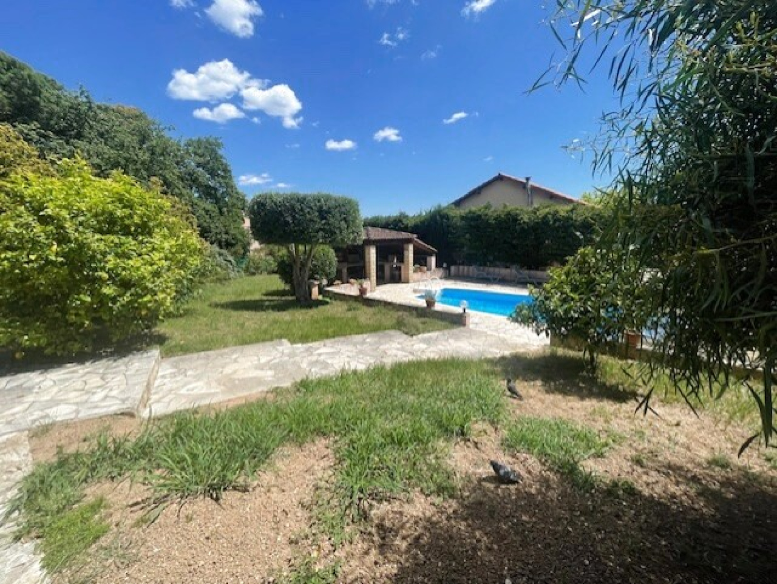 Villa de 120 m2 de plain-pied édifiée sur une parcelle de terrain de 1800 m2 avec piscine , pool house , un terrain de pétanque et un garage .
